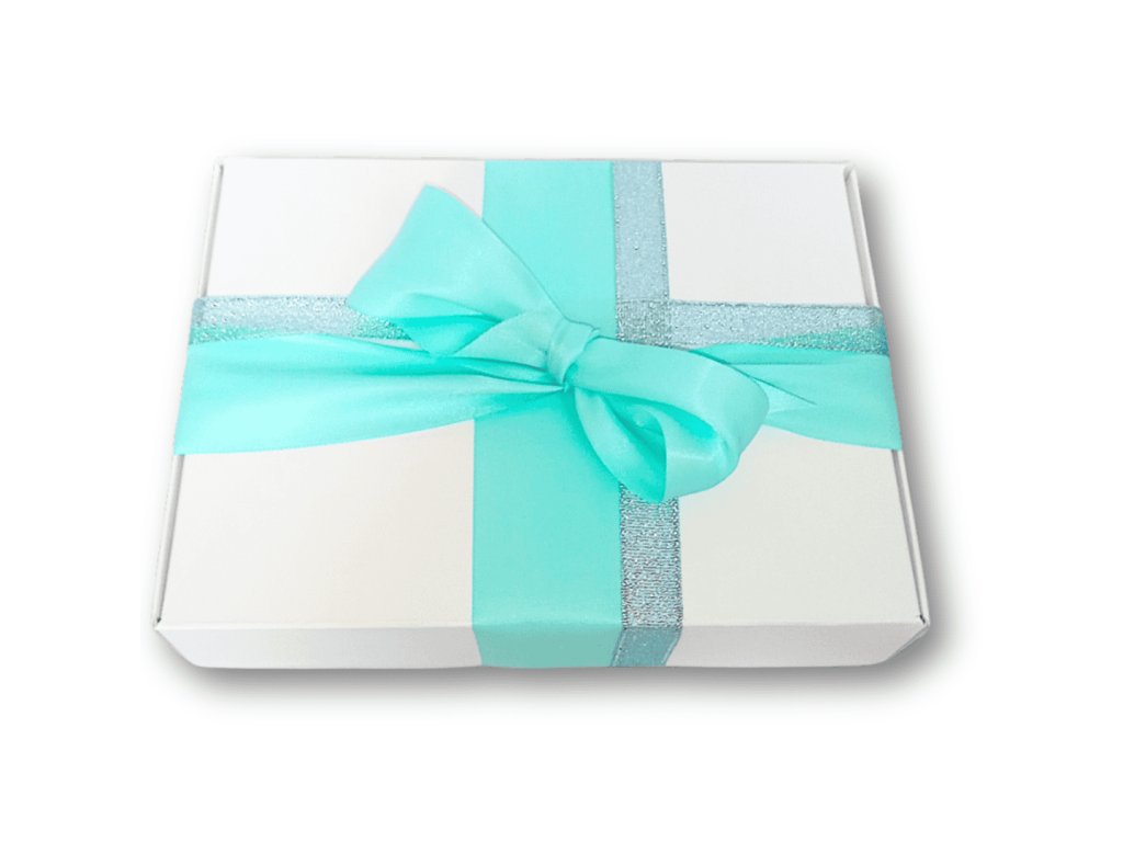 - Bílou dárkovou krabičku o rozměrech 20x15x4 cm ozdobenou barevně ladící stuhou a vyplněnou dřevitou vlnou