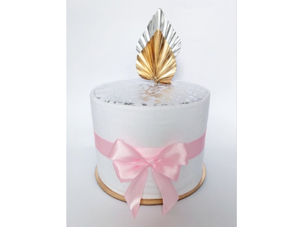 Oslňte neotřelým vzhledem - lesklý zlato-růžový kousek je určený pro milovníky minimalismu. Darujte plenkový dort pro holčičku ve zcela unikátním designu, který jinde neseženete. Precizní ruční práce je samozřejmostí.